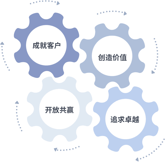 成就客户是一切决策的出发点,,,,创造价值是衡量所有工作的标准,,,,追求卓越是我们做事做人的态度,,,,开放共赢是我们的格局也是最终的结果。。。。价值观的齿轮环环相扣,,,推动着组织里的每个人不断向前。。