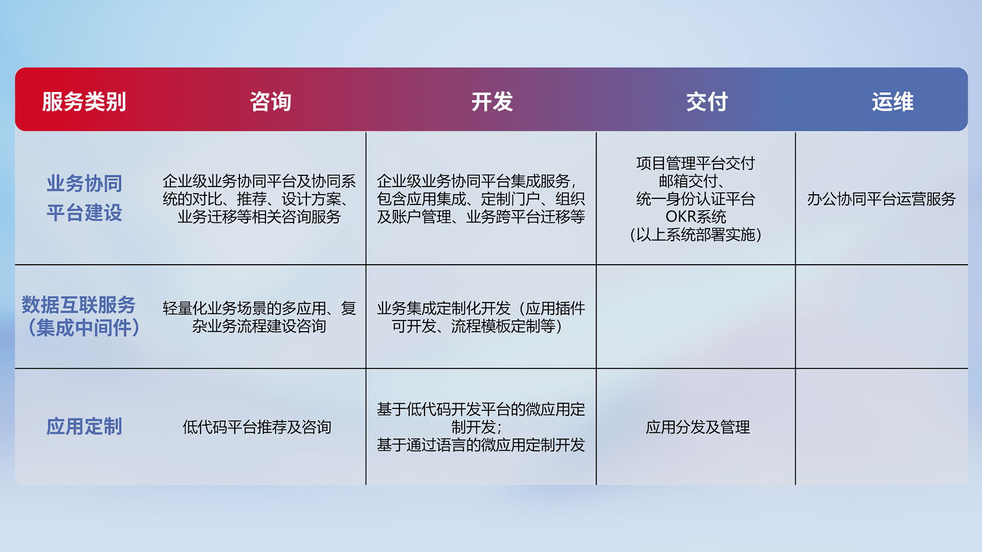 针对钉钉、、、、企微、、IDaas等平台级产品提供产品的规划、、、方案、、交付、、定制化开发等服务,,,实现如统一协同办公、、智能客户服务、、、、混合会议管理、、、、智能数据查询、、等业务场景,,,,实现数字化转型。。。。